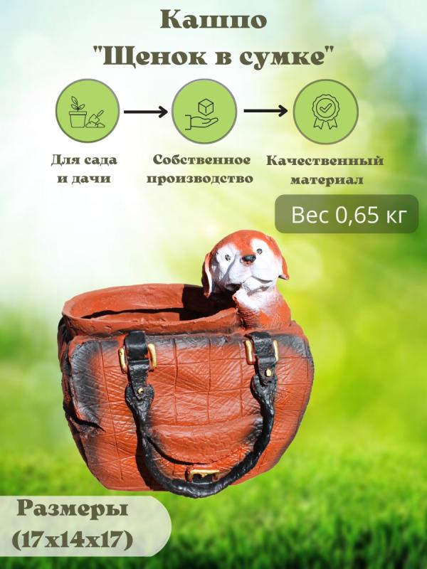 Ищете чем можно украсить сад или дачу? Кашпо-статуэтка "Щенок в сумке" станет одним из самых оригинальных элементов декора Вашего ландшафтного дизайна. Кашпо прекрасно дополнит альпийскую горку, зеленый газон и даже искусственный водоем. Прекрасный дизайн фигуры не оставит равнодушных и привлечет взгляд Ваших гостей. Материал фигурки изготовлен из искусственного камня - полистоун. Благодаря отсутствию микротрещин и пор, в теле камня не "заселяется" грибок и разные болезнетворные бактерии, кроме того хорошо переносит перепады температур. Фигурка для сада может послужить отличной идеей для подарка друзьям и близким, которые будут приятно удивлены и рады такому необычному сюрпризу. Обратите внимание на то, что каждое изделие мы тщательно упаковываем в пузырчатую пленку и коробку, чтобы фигурка пришла в полной целостности и сохранности. Не забывайте, что в нашем магазине представлен большой выбор интерьерных статуэток для дома, сада и дачи.