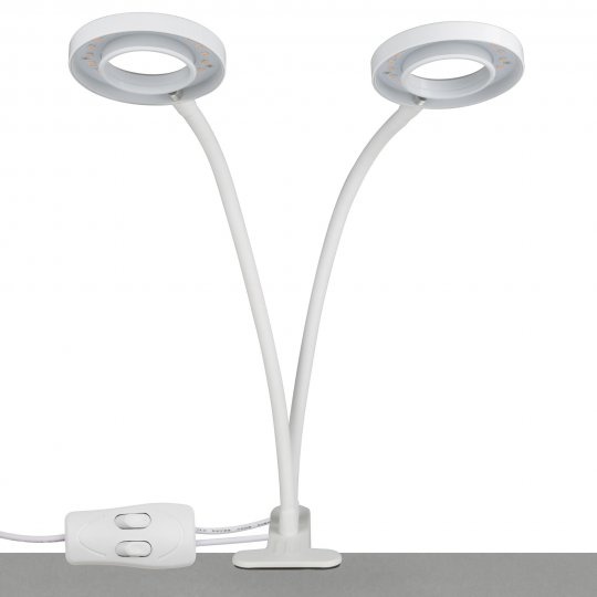 Этот светодиодный светильник предназначен для подсветки цветов, выращивание зелени, ароматных трав и ускорение роста рассады. Он имеет 2 источника света со специальным спектром свечения, который способствует активному росту растений, стимулирует цветение и зеленый цвет листьев. Потребляемая мощность всего 15 Вт, крепится он к поверхности при помощи прищепки, имеет гибкую шею с углом поворота 360 градусов. Фотосинтетический фотонный поток - 15 мкмоль/с. Данный светильник предназначен для подсветки растений в отсутствии прямых солнечных лучей, но увлекаться не стоит, нужно помнить, что растениям необходимо как минимум 7 часов в сутки для отдыха. Регулировать время освещения вам поможет встроенный таймер. Лампы не требуют замены на протяжении всего срока службы, а их ресурс составляет не менее 30000 часов.