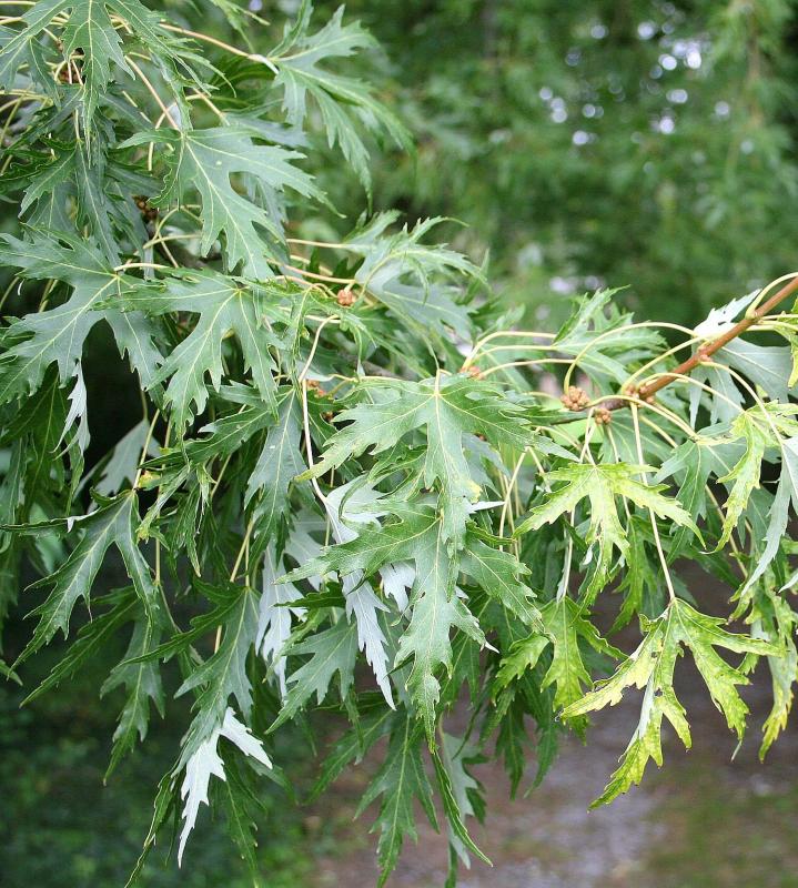 Листья: на длинных черешках сверху ярко-зелёные, снизу — серебристые, глубоко разрезаны на 5 лопастей с крупными зубцами. Осенняя окраска — жёлтая или оранжевая с пурпурно-красноватым оттенком.