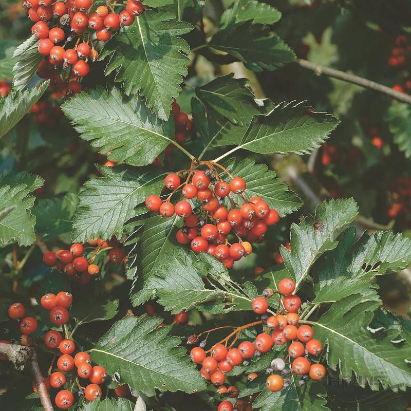 Листья: Главное отличие от рябины обыкновенной — цельные, продолговато-яйцевидные листья длиной до 10–12 см. Они имеют неглубокие лопасти (напоминают листья дуба), сверху темно-зеленые и блестящие, снизу покрыты густым сероватым войлочным опушением. Осенью окрашиваются в желто-оранжевые или красные тона.