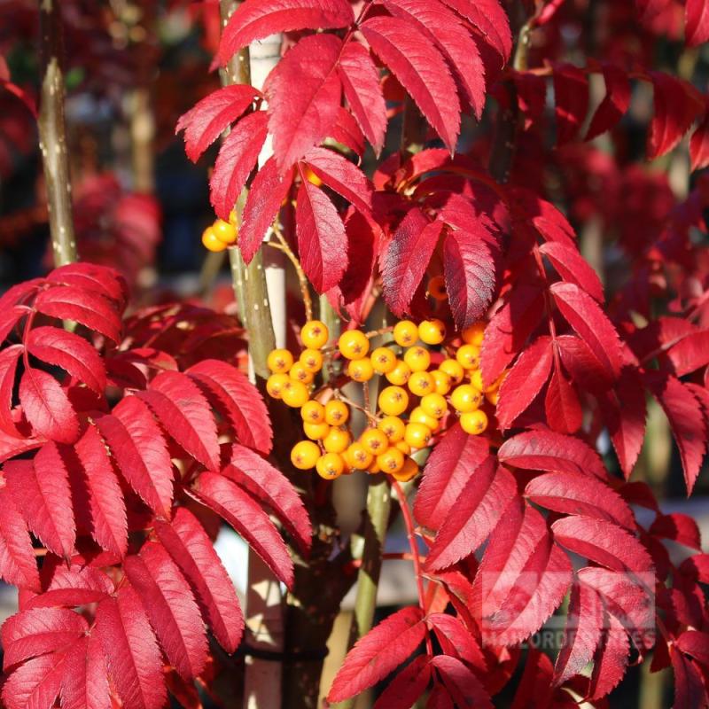 Плоды: многочисленные, шаровидные, жёлтые или оранжево-жёлтые с красным пятнышком на верхушке, менее горькие, чем у рябины обыкновенной. Созревают в конце августа — начале сентября и долго сохраняются на дереве.