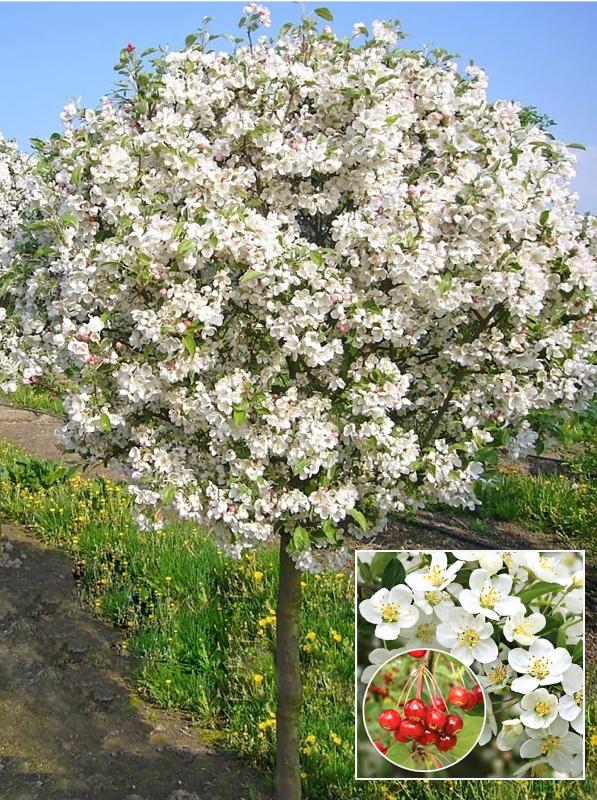 Яблоня декоративная Саржента «Тина» (Malus sargentii 'Tina') на штамбе — это миниатюрное дерево с плотной, плоско-шаровидной кроной. Она ценится за компактные размеры и чрезвычайно обильное цветение.