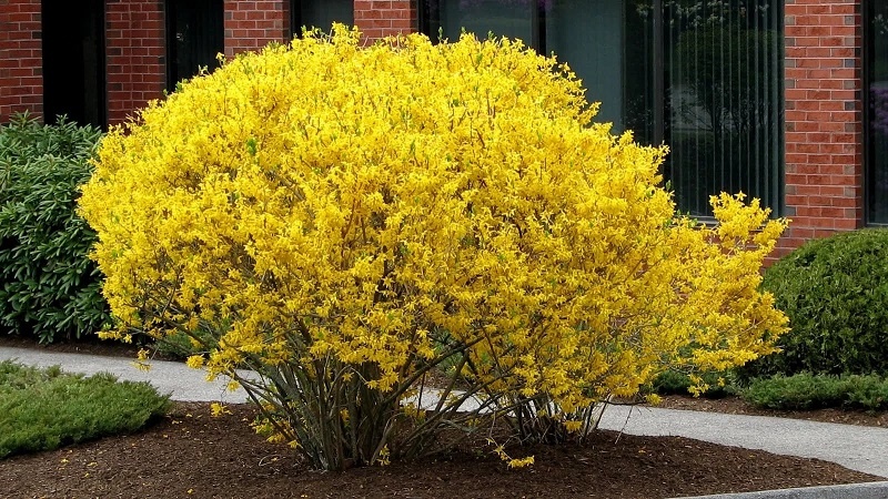 Форзиция промежуточная — раскидистый кустарник высотой до 2–3 м. Кора молодых ветвей светло-коричневая.