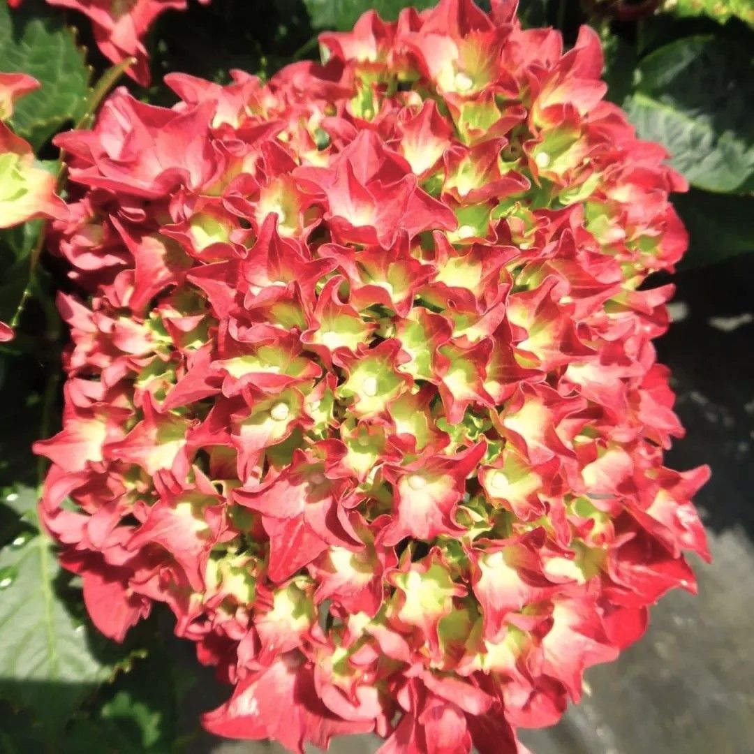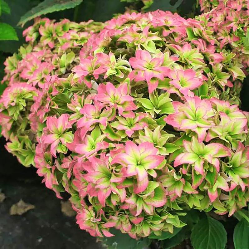 Цветы: со слегка «надорванными» лепестками, диаметром около 5 см, собраны в шары-соцветия. Цветы двухцветные — зеленоватого и розового оттенка. Особенность — постоянная смена оттенка в течение сезона: сначала на лепестках присутствуют оба оттенка, затем зелёный заменяется розовым, а к осени они обесцвечиваются до бледно-зелёного.