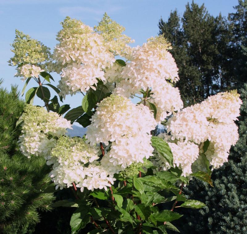 Соцветия крупные, длиной до 30–40 см, при правильном уходе могут достигать до 60 см. Соцветие конической формы с выступами, состоит из белых стерильных цветков, к осени приобретает розоватый оттенок.