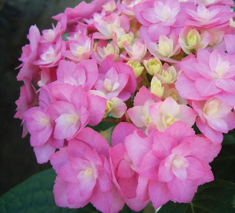 Соцветия крупные, до 30 см в объёме, состоят из большого количества махровых, нежно-розовых цветков с жёлтой серединкой.
