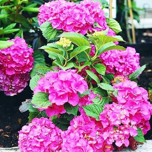 Соцветия: крупные (до 20–25 см в диаметре), шаровидные, плотные. Цветки стерильные, насыщенного розового цвета, интенсивность которого зависит от кислотности почвы. На кислых почвах цвет может приобретать фиолетовые или сиреневые оттенки, на нейтральных и слабощелочных — остаётся ярко-розовым.