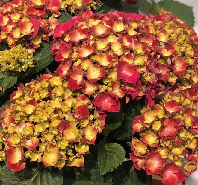 Соцветия — крупные из множества мелких цветков, окраска — насыщенный красный с оранжевым оттенком. Оттенок цветков сохраняется длительное время, не теряя насыщенности под воздействием солнечных лучей.