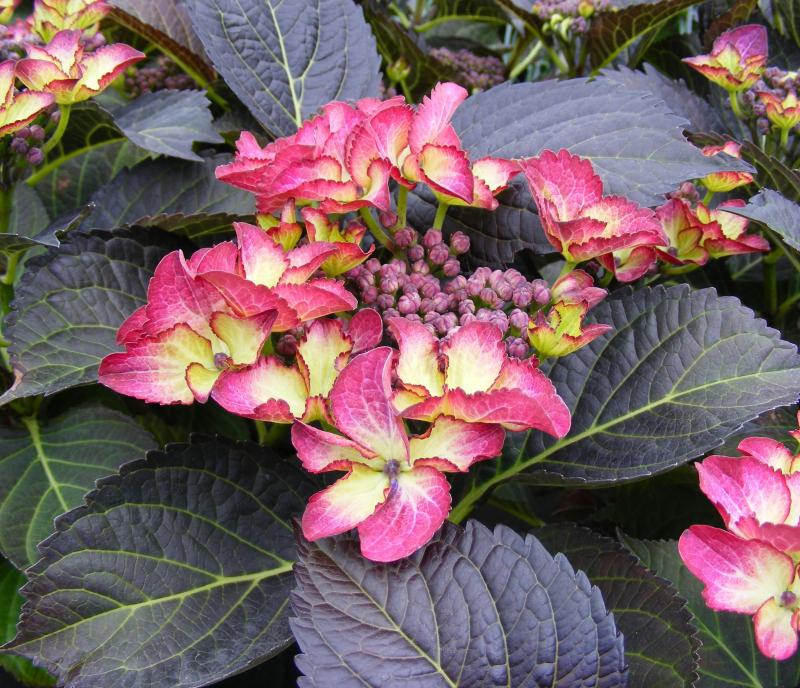 Dark Angel — крупнолистная гортензия, декоративный кустарник.