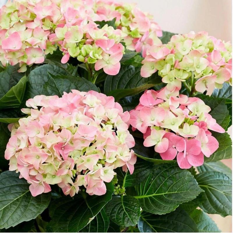 Соцветия шаровидной формы, достигают в диаметре до 15 см, состоят из множества мелких цветков (диаметр — около 3 см). В начале развития соцветия имеют нежно-фисташковый или оливковый оттенок, затем постепенно переходят в тёмно-розовые и ярко-красные тона.