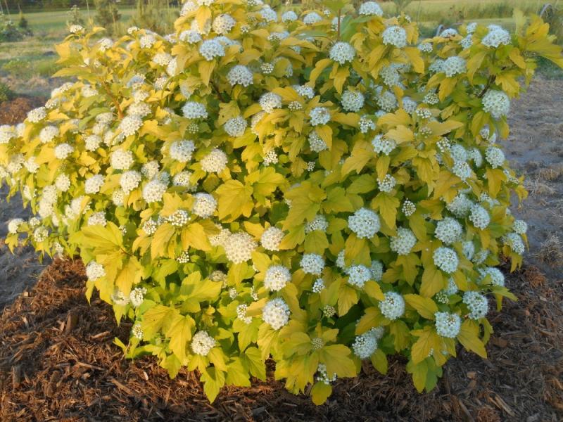 Пузыреплодник калинолистный 'Luteus' (Лютеус) — эффектный кустарник до 3 м высотой, ценимый за яркую листву: при распускании оранжево-желтая, летом зеленеет, осенью золотистая, а также белые соцветия и красные плоды-листовки, что делает его декоративным весь сезон, неприхотлив, быстро растет, светолюбив (в тени бледнеет), зимостоек, хорош для живых изгородей и композиций.