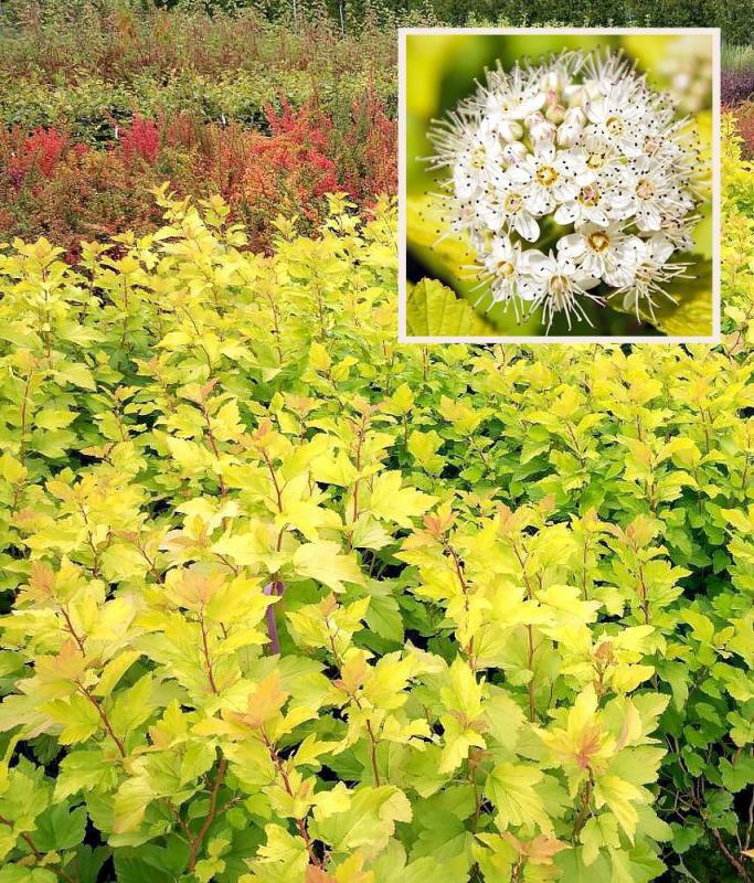 Кустарник высотой до 1,5 метров. Листья меняют окраску в течение сезона: при распускании ярко оранжево-желтые, в середине лета слегка зеленеют, затем быстро восстанавливается золотистая окраска. Цветет в начале июня мелкими белыми или слегка розоватыми цветками, которые собраны в плотные щитковидные соцветия. Плоды — сборные, вздутые листовки, появляются в августе-сентябре и долго сохраняются на кустах.Оригинально смотрится в живых изгородях, благодаря сочной, немного дерзкой листве. Его способность быстро расти и освежать любой ландшафт незаменима, если нужно скрыть неприглядные постройки или заборы. Растение отлично подходит для сада, красиво смотрится весной, летом, осенью. Зимой пузыреплодник сохраняет плоды, но их декоративность уже относительна.