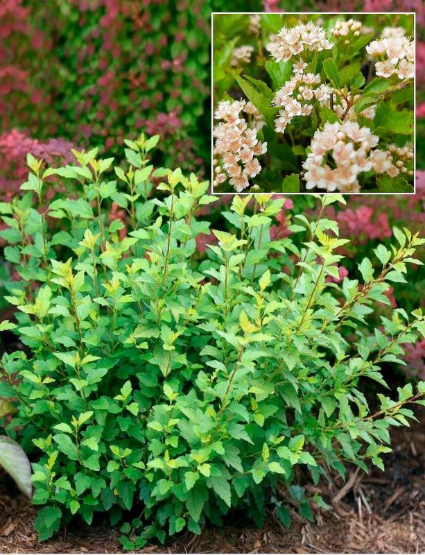 Литл Грини обладает шаровидной густой кроной, минимальной высотой в пределах 50 см, шириной 30-40 см, покрытой изящными резными листьями небольшого размера. Лопастная листовая пластина испещрена множеством прожилок, окрашена в зеленый цвет, но оттенки меняются в зависимости от возраста листвы. Молоденькие листочки окрашены в нежные оттенки салатового цвета по краям, с розово-красной сердцевиной. По мере роста листва становится зеленой, к концу лета появляется легкий золотистый или бронзовый оттенок.К началу цветения верхушки побегов украшают грозди зонтиковидных соцветий, состоящих из бутонов темно-розовых или розовато-багряных оттенков. В полном роспуске соцветия состоят из белоснежных или розоватых цветков со множеством длинных тычинок с розовыми пыльниками. По окончании цветения образуются пузырчатые плоды, несъедобные для человека, но чрезвычайно любимые птицами в зимний период, поскольку они остаются на ветках до самой весны. Плоды также имеют декоративную окраску от розовых до темно-пурпурных.