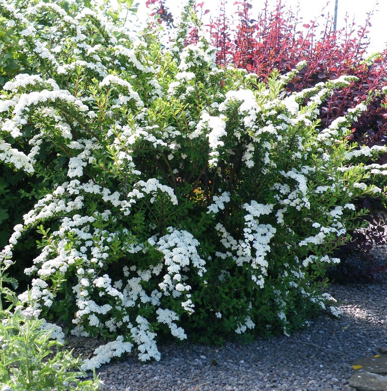 Кустарник до 1-2 м высотой, с густой округлой кроной и прямостоячими ветвями, горизонтально отклонёнными в верхней части. Листья мелкие, эллиптические, тёмно-зелёные, с нижней стороны сизовато-зелёные, сохраняют окраску до поздней осени. Иногда успевают окраситься в пурпурно-коричневый цвет. Цветки желтовато-белые в выпуклых щитковидных соцветиях до 5 см диаметром, густо покрывающих ветви. Цветёт на прошлогодних приростах. Устойчива в городских условиях. Хорошо переносит обрезку, которую проводят после цветения.