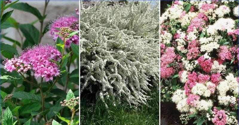 Летнецветущие: Цветут на побегах текущего года (например, Спирея японская и ее сорта), соцветия розовые, красные, белые, собраны в щитки.