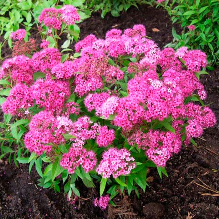Спирея японская «Дартс Ред» — это невысокий (до 1 метра) плотный кустарник с прямостоячими побегами.