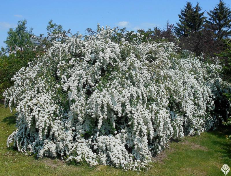 Кустарник высотой 2 м, шириной 3 м. Побеги покрывают не опушенные листья обратнояйцевидной формы с 3-5 лопастями и зубчатым краем. Наружная поверхность темно-зеленая. Нижняя часть листьев более темная, тускло-сизая. Их длина достигает 3,5 см. Соцветия множественные, имеют полушаровидную форму, равномерно покрывают побеги по всей длине. Цветки имеют белые лепестки и желтую середину. С начала лета в течение 2-3 недель.Применяется в групповых и одиночных посадках. С ее помощью можно создать прекрасные живые изгороди, практически не требующие ухода.