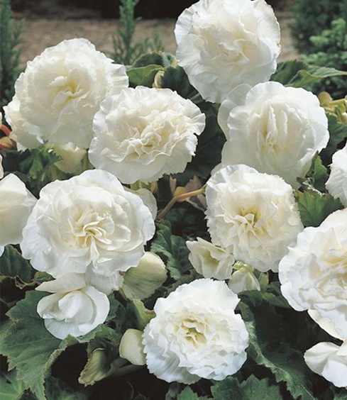 Цветки: Густомахровые, чисто-белые, крупные, с волнистым краем лепестков.