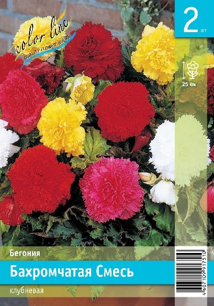 Бегония Кустовая Бахромчатая, или Бегония Фимбриата (Begonia Fimbriata), представляет собой декоративное клубневое растение с пышными, махровыми цветками и характерными изрезанными, бахромчатыми краями лепестков, что создает эффект гофрированной ткани. "Смесь окрасок" означает набор клубней или семян, включающий растения с цветками различных ярких цветов, таких как белый, красный, желтый, оранжевый и лососевый.