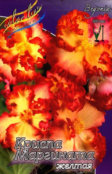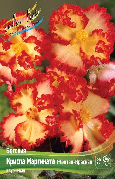Бегония "Криспа Маргината Желтая-Красная" (Crispa Marginata Yellow-Red) — это популярный сорт клубневой бегонии, который ценится за свои крупные, эффектные двухцветные цветы с гофрированными краями. Растение образует компактный куст и подходит как для выращивания в горшках, так и для оформления бордюров.