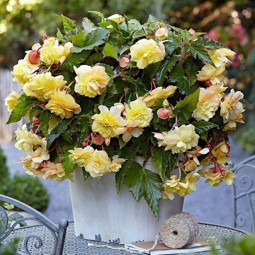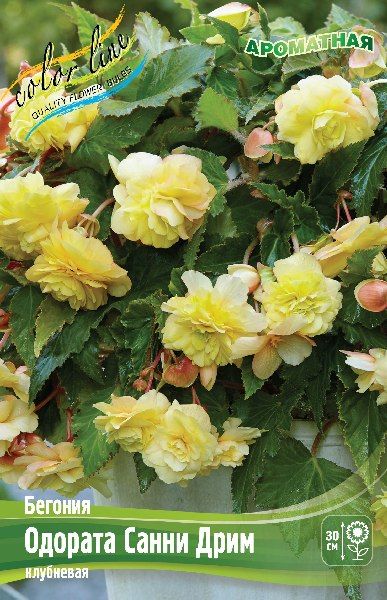 Бегония Odorata Sunny Dream (Одората Санни Дрим) — это ароматный, клубневой сорт с раскидистым кустом и свисающими побегами, который идеально подходит для балконов и подвесных кашпо, а также для полутенистых мест в саду. Растение отличается нежными, махровыми цветками лимонно-желтого цвета с белыми кончиками и тонким, сладким ароматом, а листья крупные, глянцевые, сердцевидные, с зубчатым краем. Высота куста 25-30 см, размер цветка до 10 см.