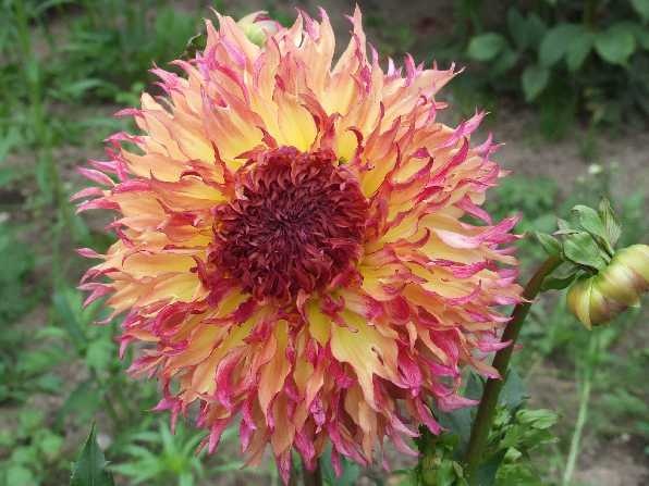 Георгина 'Myrtle's Folly' — это эффектный бахромчатый (или полукактусовый) сорт с крупными цветами, отличающийся уникальным сочетанием розового, персикового, кораллового и желтого оттенков.