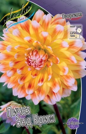 Георгина сорта Peaches and Cream (Пичес энд Крим) — это эффектный декоративный сорт с нежными, многоцветными соцветиями, напоминающими персики со сливками, с оттенками лимонного, кремового, розового и белыми кончиками лепестков, достигающий 100-130 см в высоту, с крупными махровыми цветками диаметром до 15-20 см, цветущий с июля до осени, универсальный для клумб и срезки, требующий выкопки клубней на зиму.