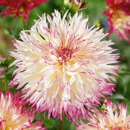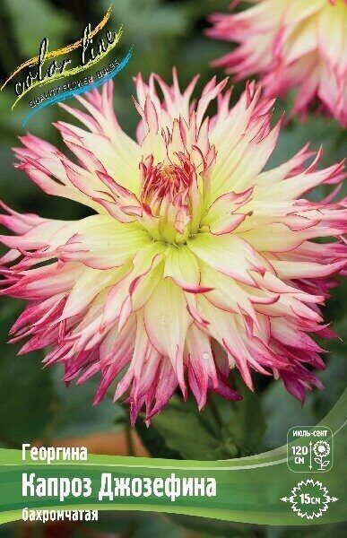 Георгина 'Caproz Josephine' — это многолетнее травянистое растение, отличающееся крупными бахромчатыми (fimbriata) цветками кремово-желтого оттенка с контрастными розово-пурпурными кончиками лепестков.