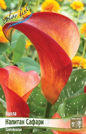Калла 'Капитан Сафари' (Calla Captain Safari) — это многолетнее клубневое растение, ценящееся за свои яркие, желто-оранжево-розовые цветы и декоративные листья с белым крапом.