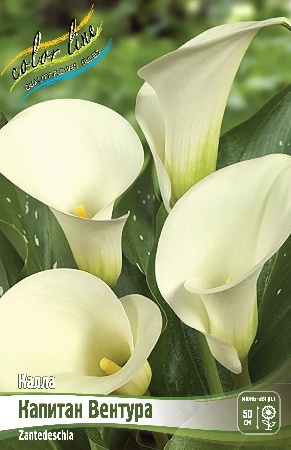 Калла 'Капитан Вентура' (Calla 'Captain Ventura') — многолетнее травянистое клубневое растение высотой 40–50 см с характерными белыми соцветиями и декоративными листьями.