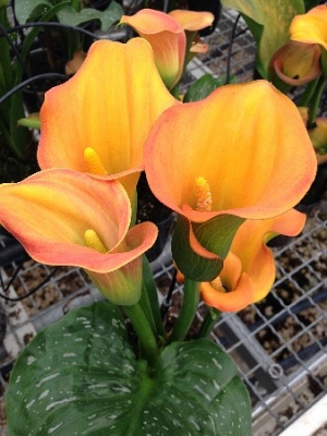 Цветы: Насыщенного оранжевого цвета, воронковидной формы (прицветник) оборачиваются вокруг цилиндрического початка. Цветки плотные, могут иметь слегка восковую текстуру и долго сохраняют свой вид как на растении, так и в срезке (до 1,5-2 недель).