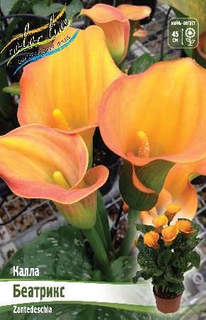 Калла "Беатрикс" (Beatrix) — декоративный многолетний сорт, отличающийся насыщенными оранжевыми цветками и глянцевыми листьями с белым крапом. Она достигает в высоту примерно 45-60 см и подходит как для выращивания в горшках, так и для оформления клумб.