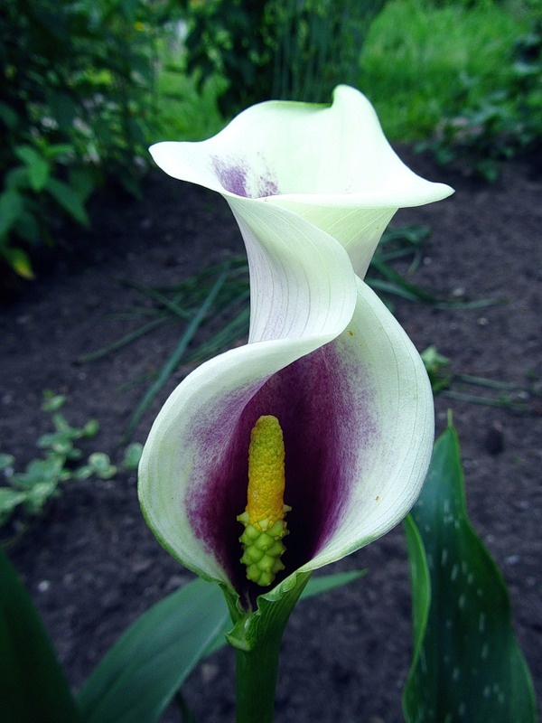 Цветок: Главной особенностью сорта является его уникальная двухцветная окраска. Покрывало (прицветник) цветка преимущественно белое с выразительным, глубоким темно-фиолетовым или чернильным пятном/горлом внутри. Цветки немахровые, воронковидной формы, диаметром около 8 см.