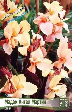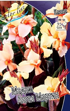 Канна 'Madame Angele Martin' – это многолетнее корневищное растение, ценящееся за свои крупные, кремово-розовые с персиковым оттенком цветки и декоративную пурпурно-бронзовую листву.