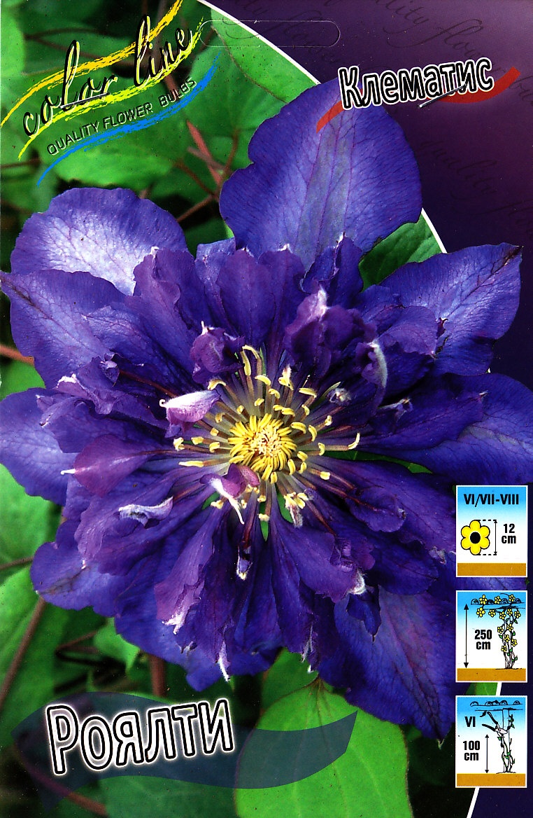 Цветки: Крупные, диаметром от 10 до 15 см. На побегах прошлого года (первое цветение) цветки обычно полумахровые, насыщенного фиолетово-пурпурного или сине-лилового оттенка, с более светлой полосой по центру лепестка и контрастными желтыми тычинками. На побегах текущего года (второе цветение) цветки, как правило, одиночные (простые).