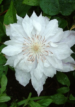 Клематис 'Жакмана Альба махровый' (Clematis Jackmanii Alba Plena) — это крупноцветковая, сильная листопадная лиана с пышными белыми или голубовато-белыми цветками, которая обильно цветет в начале лета на побегах прошлого года.