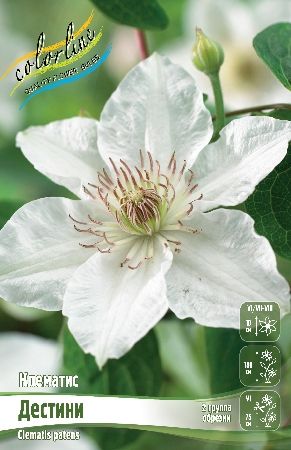 Клематис 'Destiny' – это компактный, раннецветущий сорт голландской селекции, отличающийся эффектными белоснежными цветками с волнистыми лепестками.