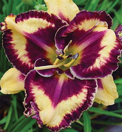 Цветки — простые, диаметр — от 12 до 15 см. Основная окраска — кремово-бежевая с бордовыми оттенками, дополнена винной каймой вокруг глазка. Горло у цветов зелёное, что создаёт контраст с основной окраской лепестков. Гофрировка краёв добавляет дополнительную текстуру.