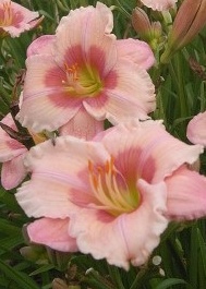 Окраска: гофрированные лепестки светло-розового цвета в центре становятся более насыщенными. Горло цветка — характерное жёлтое.