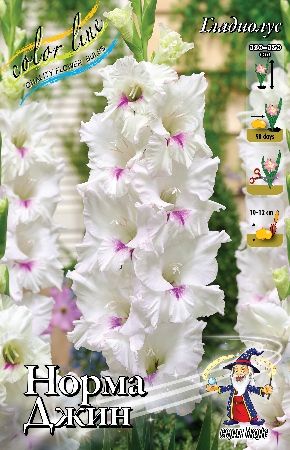 Гладиолус "Норма Джин" - крупноцветковый сорт. Цветок белый с ярким малиновым пятнышком. Растение высокое, стебель прямой и крепкий, листья узкие, линейные. Гладиолус неприхотлив в выращивании, легко размножается клубнелуковицами или клубнепочками. Любит обильный полив, после полива почву вокруг растения взрыхляют и окучивают. Перед посадкой в почву рекомендуется внести минеральное удобрение для луковичных цветов, хорошо взрыхлить и дренировать. Посадку клубнелуковиц производят весной с апреля по май.