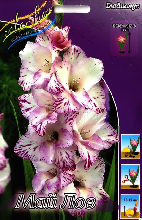 Гладиолус крупноцветковый Май Лав цветет соцветиями молочного цвета. На белом фоне живописно смотрится легкий крап в виде полосок. Эти розовые штрихи подчеркивают изящность соцветий.