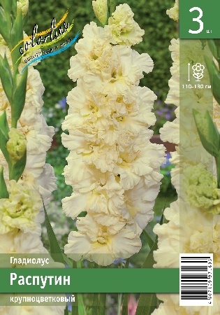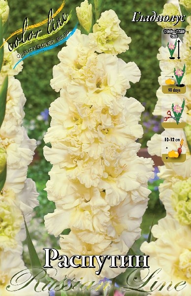 Гладиолус Распутин – это клубнелуковичное растение с вертикальным стеблем, которое может вырастать до 130 см в высоту. Листья гладиолуса линейные или мечевидные, зелёного цвета. Однако настоящая изюминка этого сорта – его гигантские цветки диаметром до 18 см воронковидной формы. Лепестки гофрированные и имеют кремовую окраску с желтоватым центром. Гладиолус Распутин начинает цвести в июле и до конца сентября. Требует выкапывания на зиму.