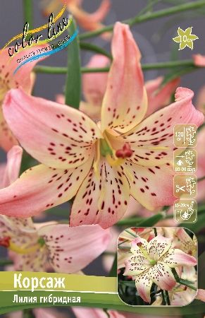 Лилия "Корсаж" (Corsage) — это азиатский гибрид с нежным кремово-розовым цветом лепестков, украшенных бордовым крапом. Это неприхотливый и зимостойкий сорт, который цветет в июле-августе. Цветки лилии достигают 10-18 см в диаметре, а само растение вырастает до 80-150 см. Она хорошо растет как на солнце, так и в полутени на хорошо дренированной, слабокислой или нейтральной почве. Внешний вид Цвет: Кремово-розовые лепестки с желтоватым центром и мелким бордовым крапом.Форма: Цветки чалмовидной формы с отогнутыми назад лепестками.Размер цветка: До 10-18 см в диаметре.Аромат: Практически отсутствует или слабо выражен.Пыльца: Отсутствует, что делает ее удобной для букетов. Характеристики Группа: Азиатские гибриды.Высота: 80-150 см.Период цветения: Июль-август.Зимостойкость: Высокая, выдерживает морозы до \(-40^{\circ }\)C.Устойчивость: К грибным заболеваниям. Агротехника Место посадки: Солнечное или полутенистое место без сильных сквозняков.Почва: Рыхлая, питательная, хорошо дренированная, нейтральная или слабокислая.Посадка: Весной или осенью. Лунки должны быть глубиной в три диаметра луковицы.Уход: Обычный уход, без необходимости ежегодной пересадки.Применение: Подходит для клумб, бордюров и букетов.