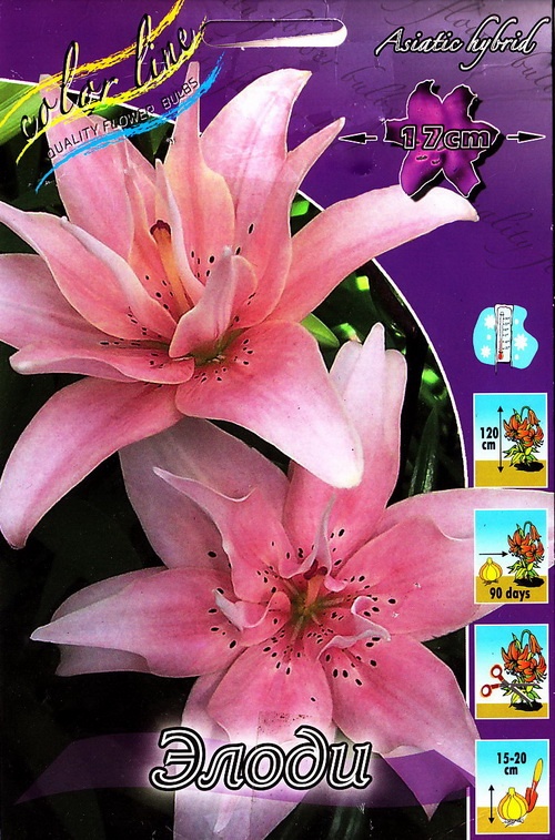 Элоди относится к среднерослым сортам, его максимальная высота – 130 см. У растения прямостоячий стебель с зелеными ланцетными листьями. Цветок не самый крупный, скорее средний – 14 см в диаметре. Он бледно-розовый, в черную крапинку (их немного), внутренняя сторона цветка – бледно-розового цвета, переходящего в пурпурный. Розово-пурпурные штрихи малочисленны. Цвет насыщенный. А горло у цветка желтовато-белое с крапом, без каймы. Элоди относится к махровым цветам. Внутренние лепестки волнистые, очень бережно отогнутые наружные, упругие, направленность – вверх. Поверхность лепестков глянцевая, тычинки у Элоди видоизмененные, пыльцы нет, аромат тоже отсутствует. Цветет в первой половине лета, июнь-июль. Цветки не крупные, не высокорослые, что хорошо для контейнерных посадок – получится невысокая лилия с выразительными, будто бы фарфоровыми цветами. Темные цветочные посадки цветение Элоди будет освежать, яркие – дополнять, разбавляя сочность цвета своей аристократичной бледностью.