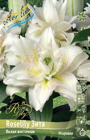 Лилия ROSELILY Зита (или Sita/Zeta) – это махровый сорт восточной гибридной лилии, отличающийся крупными (до 21 см) белоснежными или молочно-белыми цветками с желтым центром и темно-сиреневым крапом, которые не содержат пыльцы, имеют сильный аромат и выглядят очень пышно, напоминая розу, высота растения 90-100 см. Сорт зимостойкий, подходит для клумб, бордюров и срезки, предпочитает солнце/полутень и хорошо дренированную почву.