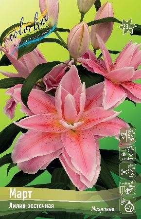 Лилия "Март" (Mart) — это, скорее всего, Восточный махровый гибрид с крупными, душистыми, густомахровыми цветками розового цвета с редкими крапинками, достигающими 15-20 см в диаметре, высотой до 120+ см, дающими сильный аромат и неприхотливыми в уходе азиатскими лилиями, которые отлично зимуют и подходят для срезки.