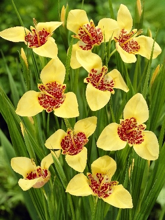 Внешний вид цветка: Цветки крупные, диаметром до 15 см, состоят из трех больших внешних лепестков яркого желтого цвета и трех меньших внутренних лепестков, которые обычно покрыты красными или бордовыми крапинками. Название "тигридия" (от лат. tigris – тигр) дано растению именно из-за пятнистого окраса центральной части цветка.
