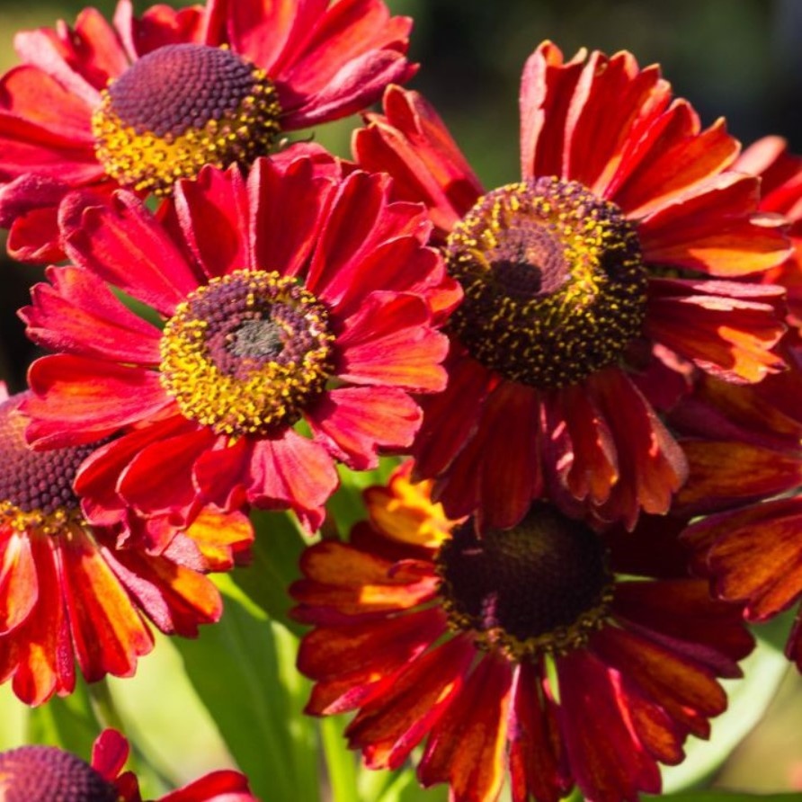 Цветы: Многочисленные мелкие соцветия-корзинки диаметром около 2,5–3 см. Окрас лепестков — темно-рубиновый или бордово-красный, со временем может приобретать медные или оранжевые оттенки. Центр цветка (выпуклая «пуговица») — коричневый с золотистыми или желто-красными вкраплениями.