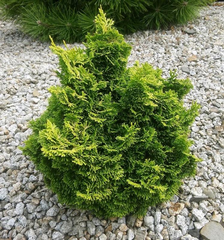 Хвоя чешуйчатая, плотная, зелёная, в молодости — золотистая, долго не теряет оттенок.