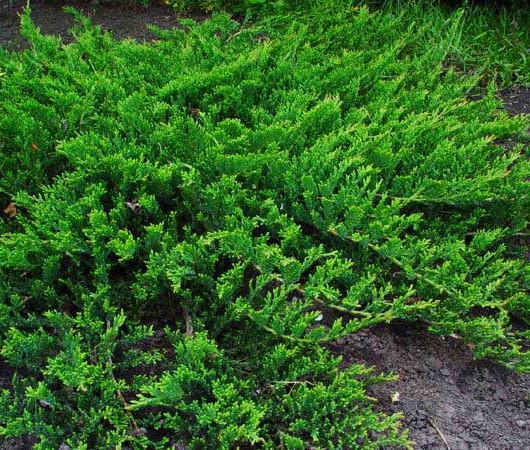 Один из самых популярных почвопокровных вечнозеленых кустарников. Его способность укрывать землю плотным зеленым ковром практически не дает шансов сорнякам, поэтому с помощью этого прекрасного сорта ландшафтные дизайнеры создают целые можжевеловые газоны. Крона стелющаяся яркого зеленого с голубым оттенком цвета к зиме становится бронзовой. Высота – 0,3м, диаметр – 2,5м, растет медленно. Хвоя жесткая чешуйчатая плотно прилегает к побегам. Плоды – темно-синие шишкоягоды около 6мм в диаметре. Обладает фитонцидными и инсекцидными свойствами, поэтому прогулки по можжевеловым аллеям очень прия